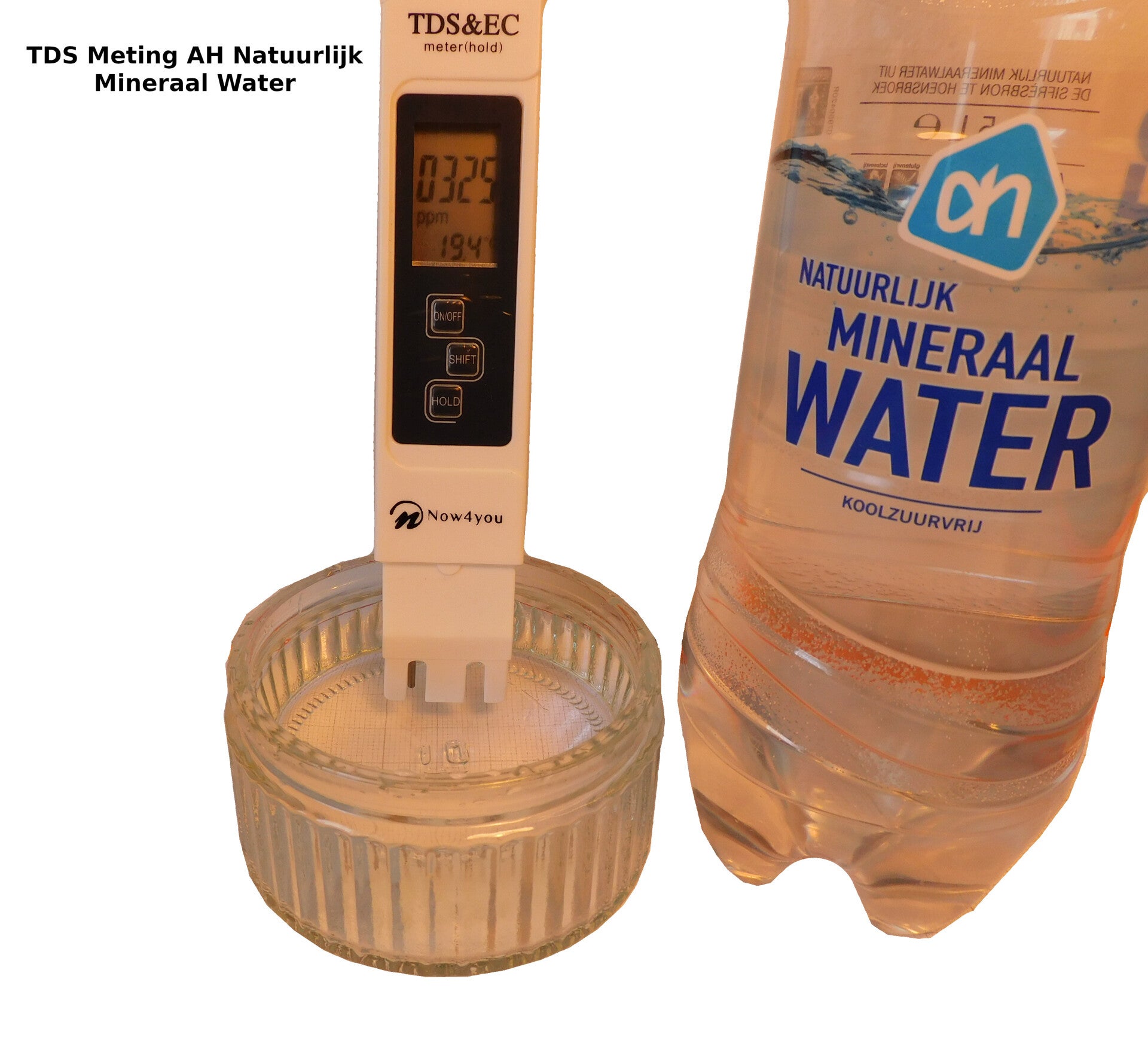 Misschien heeft u er wel eens over gehoord, maar als dat niet het geval is, raad ik u aan om verder te lezen. Een TDS meting meet de hoeveelheid van het totaal opgeloste vaste stoffen dat zich in een vloeistof bevindt. Deze meting vindt plaats door het gebruik van elektrische geleiding, hoe meer geleiding, des te groter de hoeveelheid opgeloste stoffen. De afbeeldingen hieronder laten de TDS-metingen zien van gedestilleerd water, kraanwater, Spa Blauw, Evian, AH fleswater, Chaudfontaine, Bar le Duc, en kraanwater.